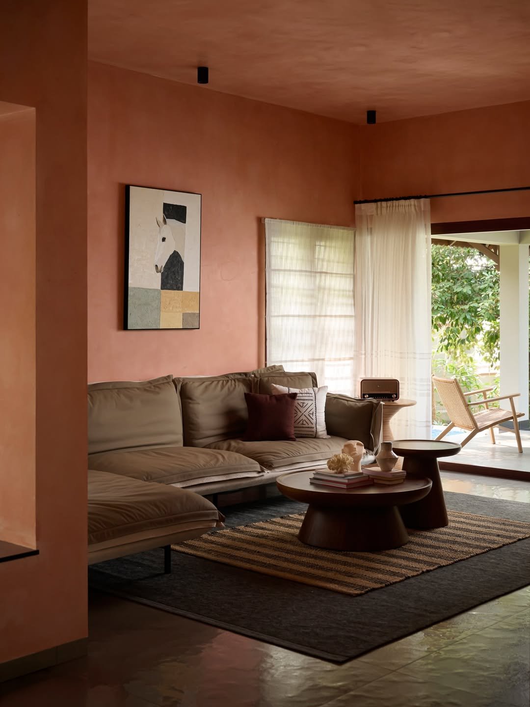 That muted terracotta wall sets the tone instantly. It wraps the room in warmth while the neutral sofa and soft textiles keep everything balanced and easy.