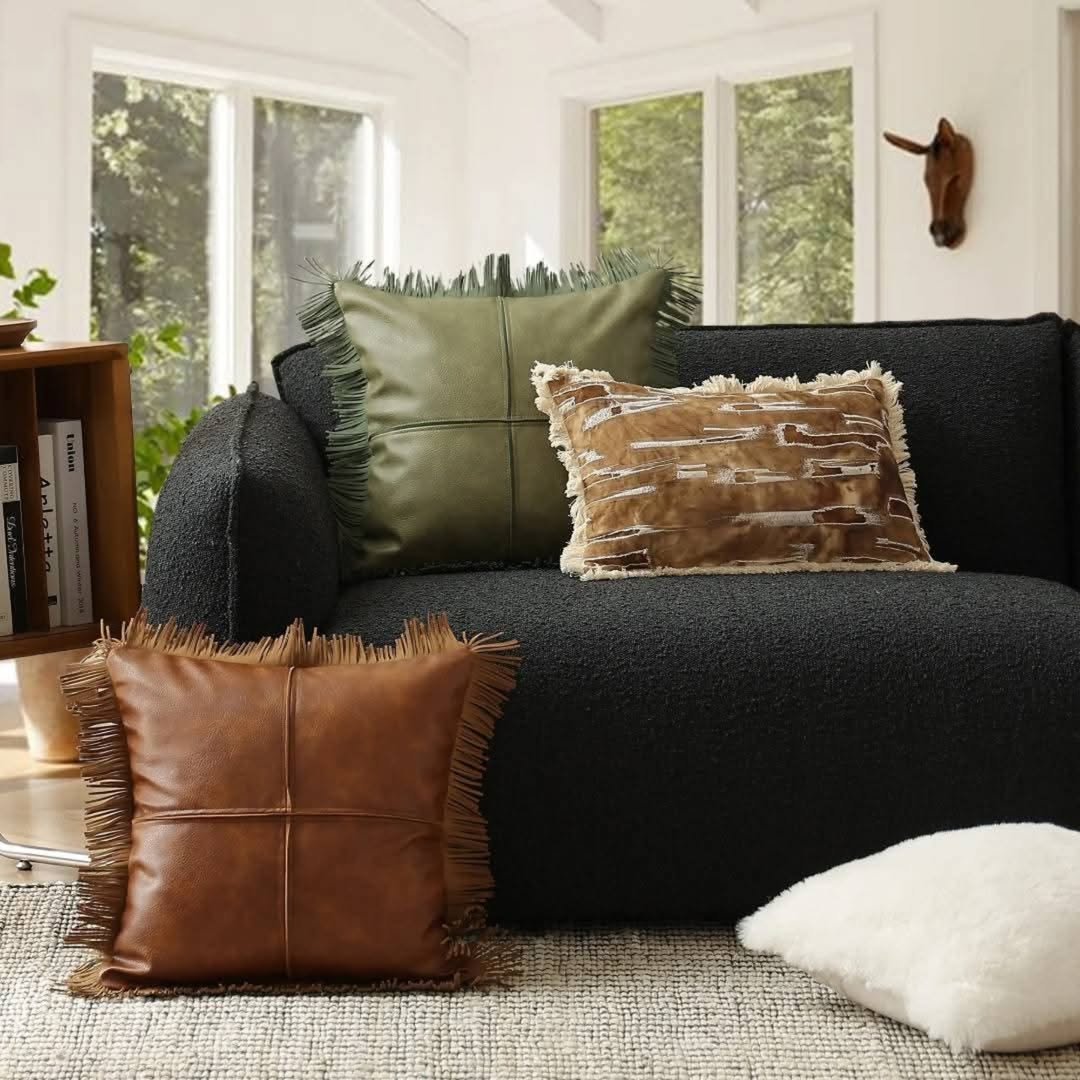The fringe, the soft sheen of leather, even the contrast against the woven rug all work together quietly. It’s the kind of corner you sink into with a book and lose track of time.