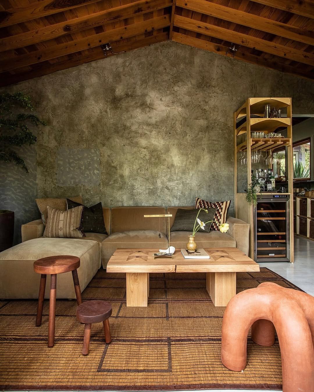 This one leans deeper into mood, and it works beautifully. The raw plaster wall, wood ceiling, and low-slung seating create a cocoon-like atmosphere that feels equal parts rustic and refined. It’s earthy, but with intention.