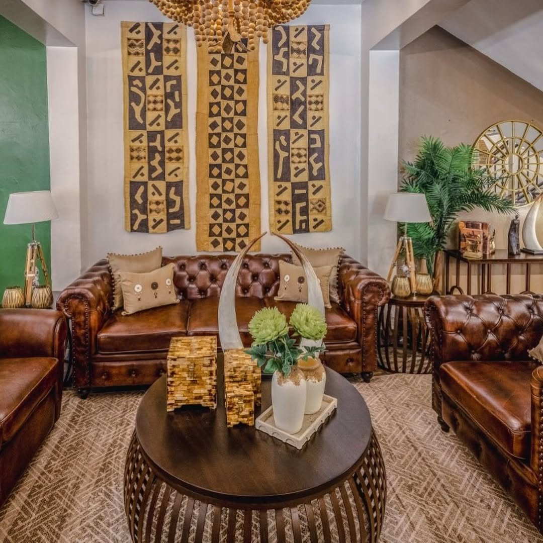 This room doesn’t hold back. Rich leather seating, tribal-inspired wall art, and deep wood tones create a space that feels confident and full of presence.