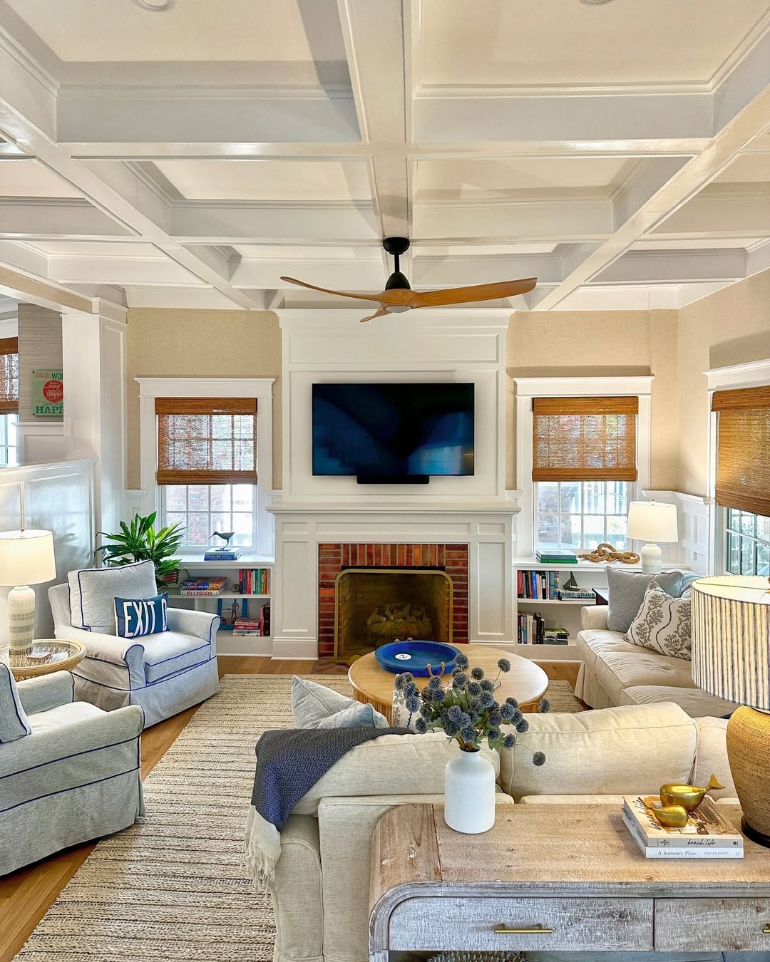 It’s subtle, but the mix of textures does all the heavy lifting. Woven shades, soft rugs, and tailored furniture create a balance that feels both put-together and inviting.