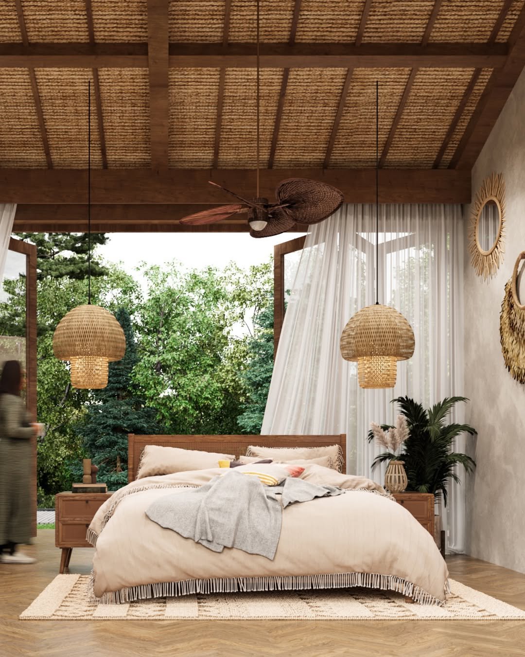 This bedroom blurs the line between inside and out so effortlessly. Natural wood, woven pendants, and soft linen layers create a space that feels open and connected to nature.