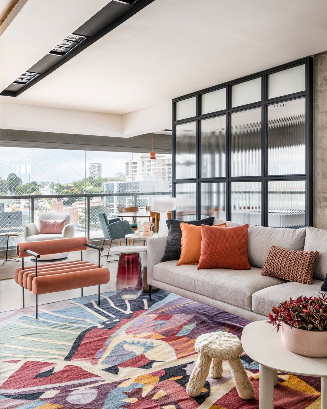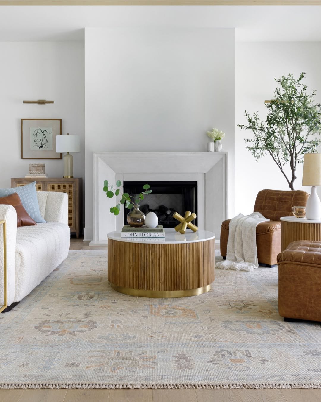 There’s a freshness here that feels a little unexpected. Soft neutral seating meets pops of rust and a bold patterned rug, bringing energy into an otherwise calm palette.