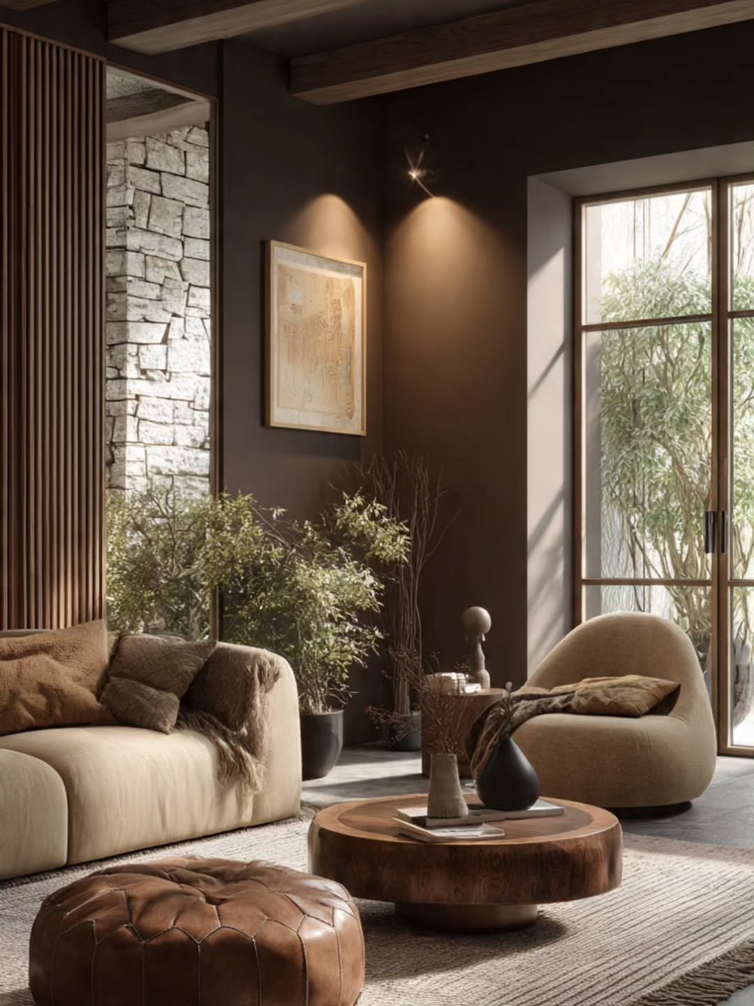 This space leans into deeper tones, and it pays off. Rich browns, soft beige upholstery, and layered lighting create a mood that feels intimate without being dark.
