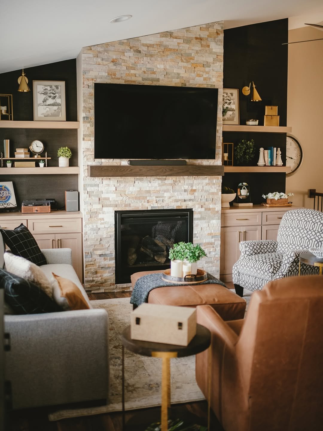 There’s a polished edge here, but it never loses its warmth. The stone fireplace adds texture, while the dark backdrop brings depth that makes the lighter woods and fabrics pop.