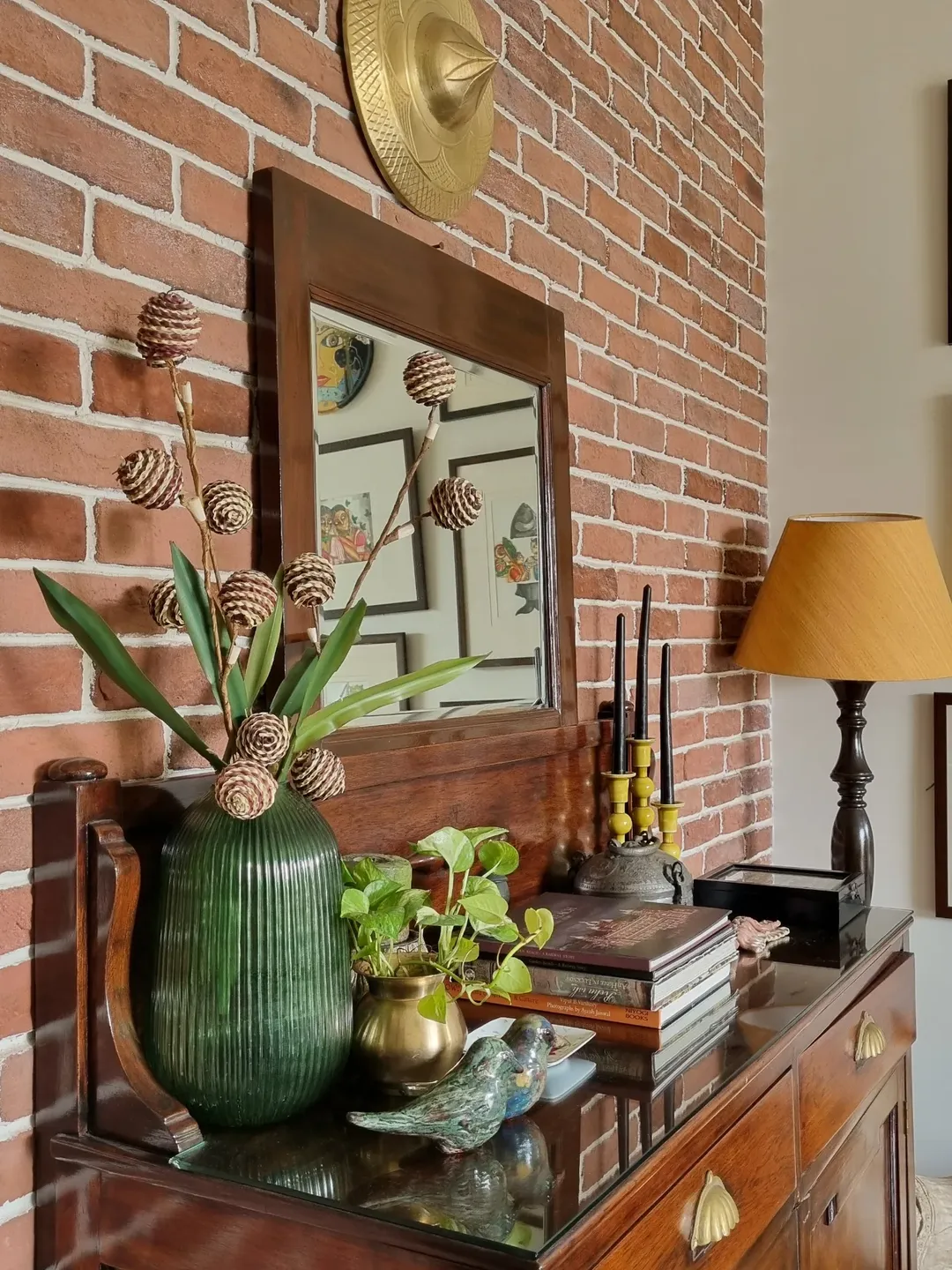 There’s something deeply nostalgic about this setup. The exposed brick wall, warm wood console, and brass accents come together in a way that feels both grounded and personal.