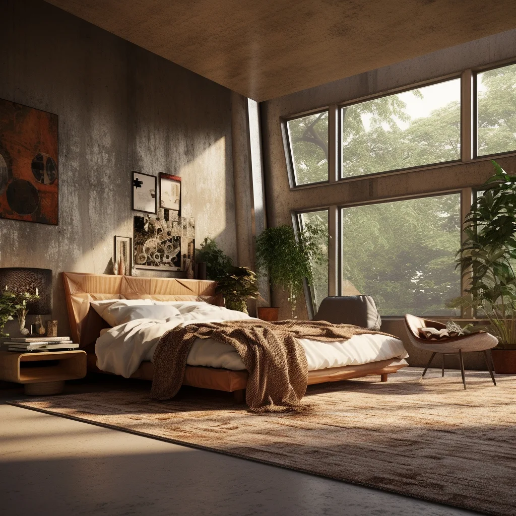 This bedroom feels like waking up inside a quiet forest. The oversized windows pull in soft green views, while the mix of raw concrete, warm wood, and rumpled linen creates that perfectly undone balance. Nothing feels overly styled, yet every texture adds depth.