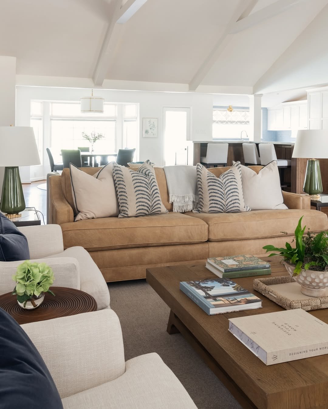 There’s something about this space that just exhales calm. Soft beige upholstery, warm wood tables, and those leafy greens scattered throughout create a palette that feels grounded but still fresh. The light pouring in only enhances it, washing everything in a soft, lived-in glow.