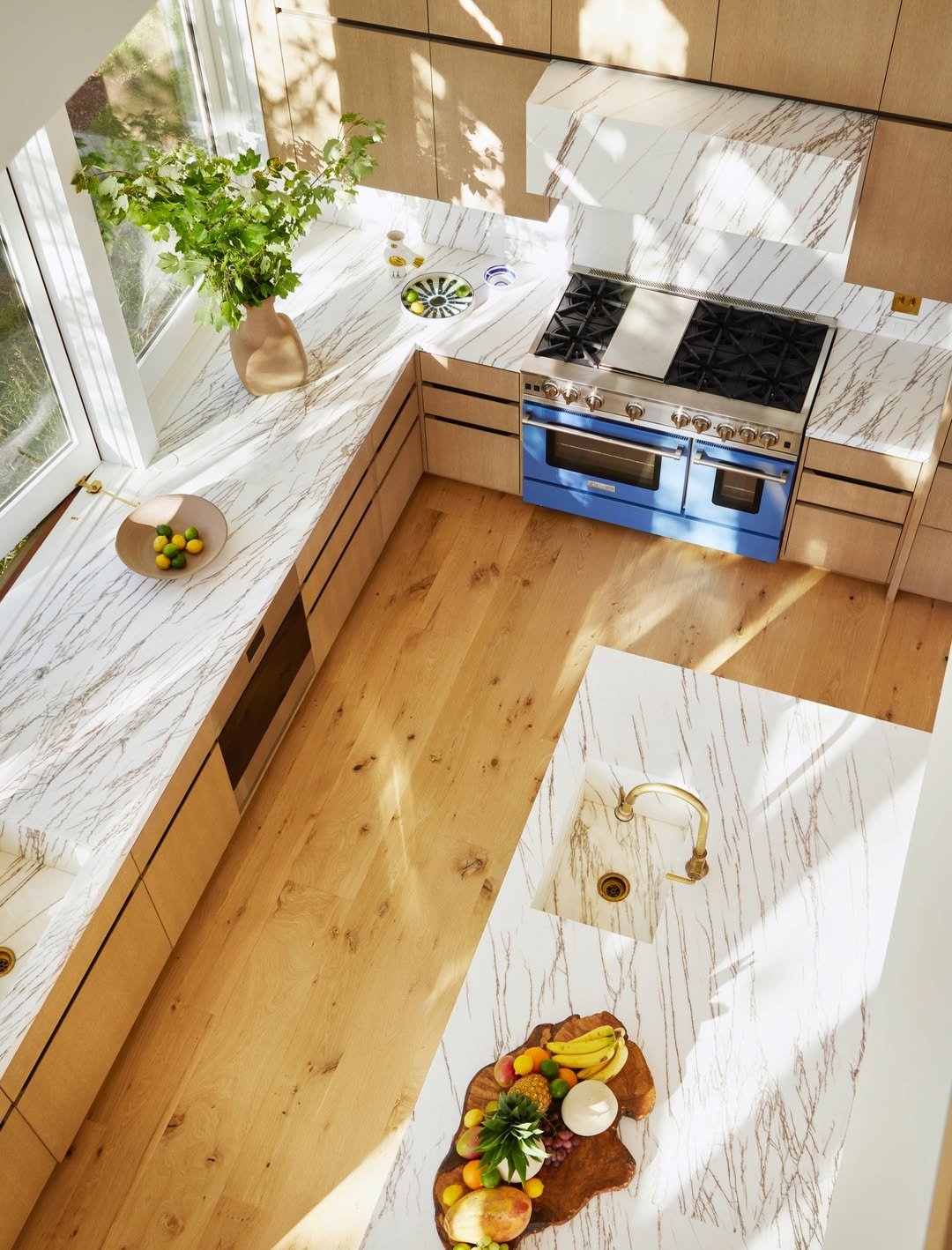 This kitchen is all about quiet luxury. The marble veining, warm wood cabinetry, and brass fixtures create a palette that feels grounded yet elevated. Even the blue range adds a hint of personality without disrupting the flow.