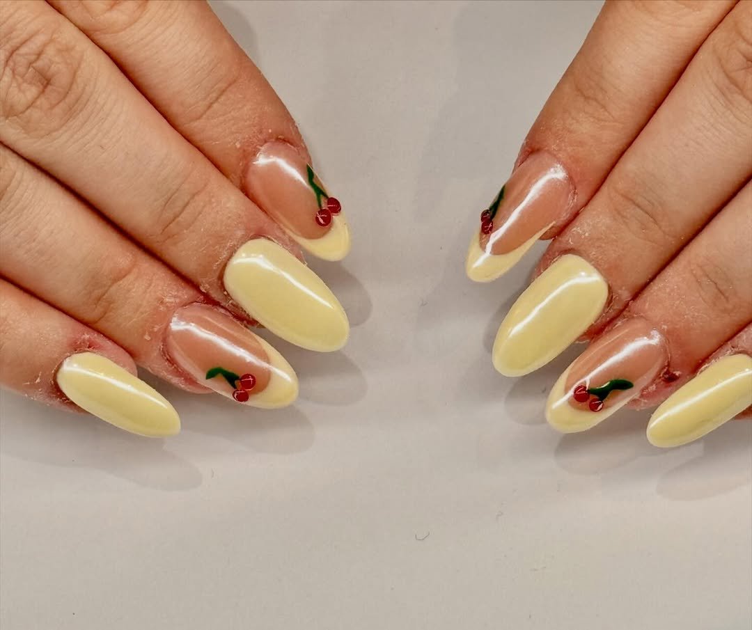 Creamy pale yellow nails are paired with tiny red cherry accents that pop against the nude base. The mix of full color and minimal art keeps the design feeling fresh.