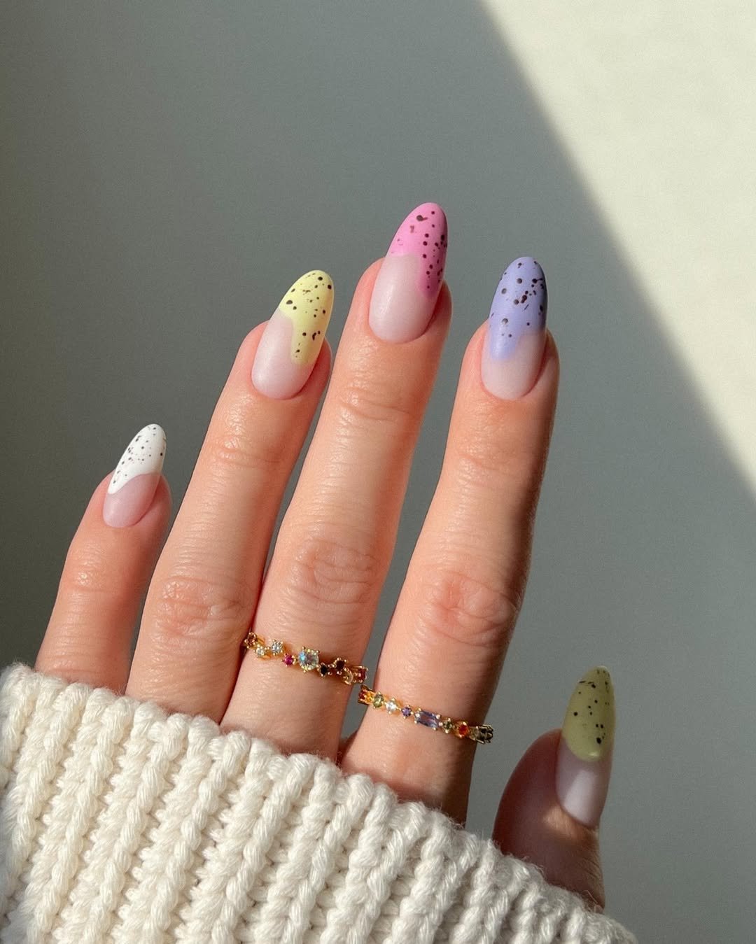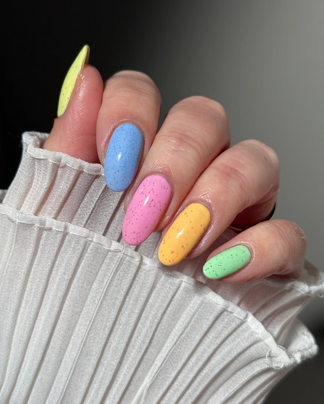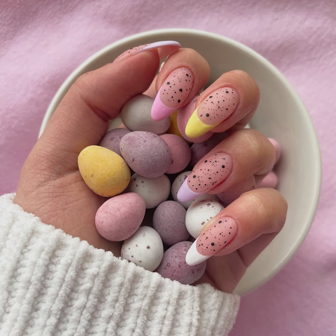 Pastel pink, soft yellow, lavender, and white tips meet that signature speckled finish, instantly channeling chocolate mini eggs. The glossy topcoat keeps it looking fresh rather than playful.