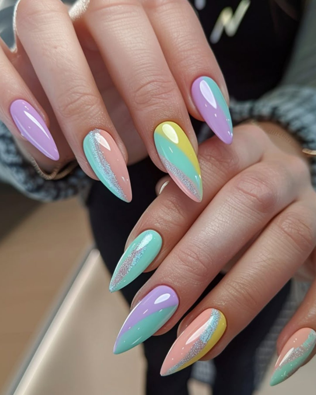 If you love your pastels with a little drama, this one delivers. Long, tapered nails carry lilac, mint, peach, and lemon in sleek diagonal sweeps, finished with a hint of shimmer that catches the light just enough.