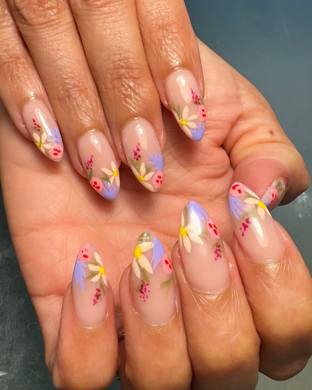 Creamy white almond nails dotted with pinks, purples, and sunny yellow blooms? It’s giving fresh bouquet on the kitchen table. The florals are scattered just enough to feel effortless, like petals caught mid-fall.