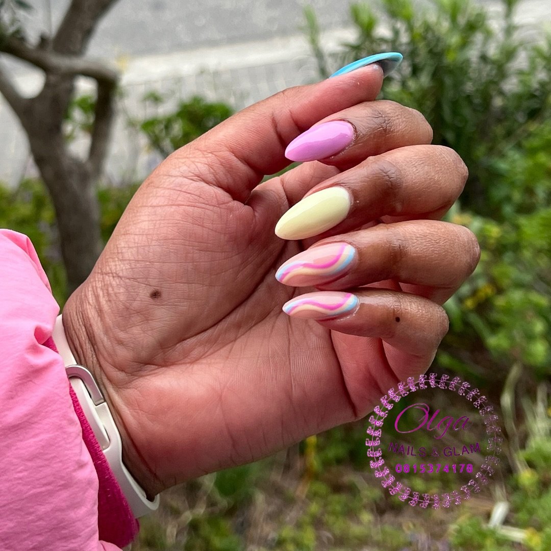 This set feels like a scoop of rainbow sherbet on a warm afternoon. Soft lilac, lemon, and sky blue dance across almond tips, with those playful wavy accents pulling everything together. It’s colorful, yes, but still polished, like someone who knows how to have fun without overdoing it.