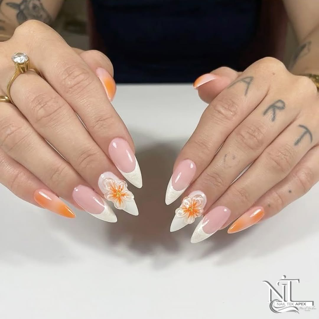 Warm peach tones fade into crisp white tips, finished with sculpted floral accents that add texture and depth. The orange detail in the petals gives it a subtle glow.