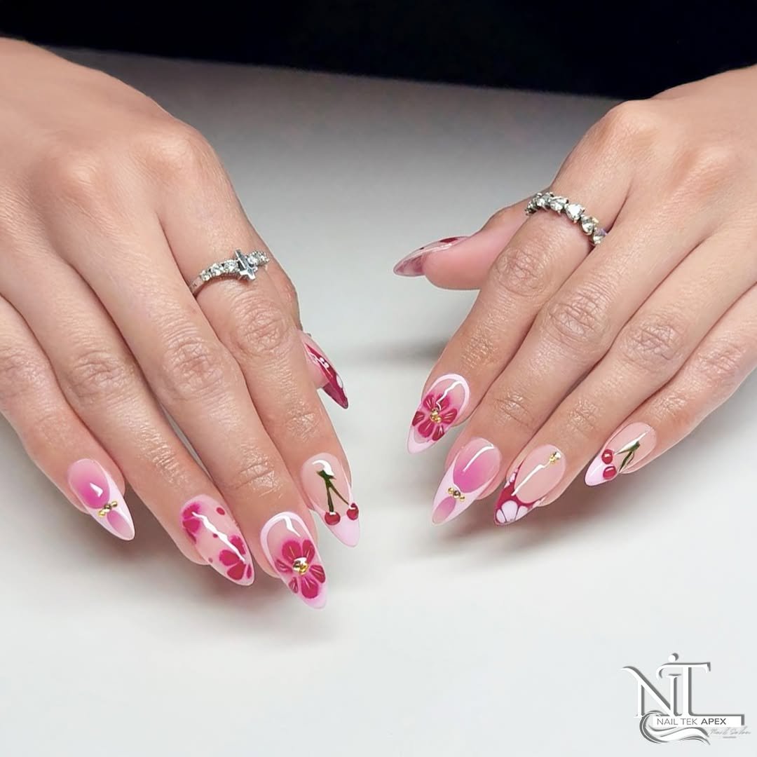 Soft pink gradients swirl across almond tips, layered with bold floral artwork and delicate gold accents. The detailing feels thoughtful, almost like miniature canvases.