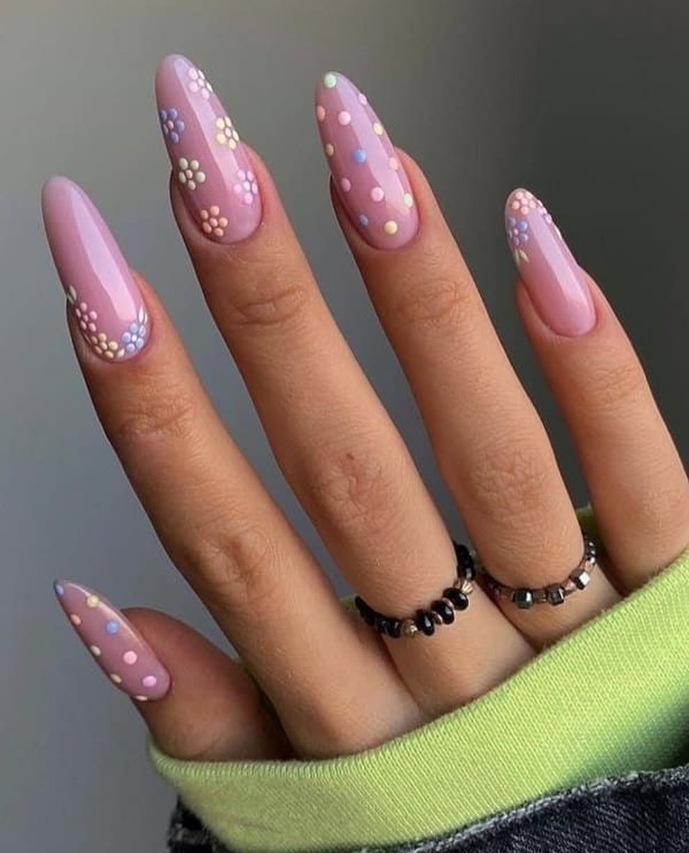 A muted mauve base sprinkled with tiny pastel dots and floral clusters keeps this design sweet and wearable. The almond shape makes the look feel elongated and graceful.