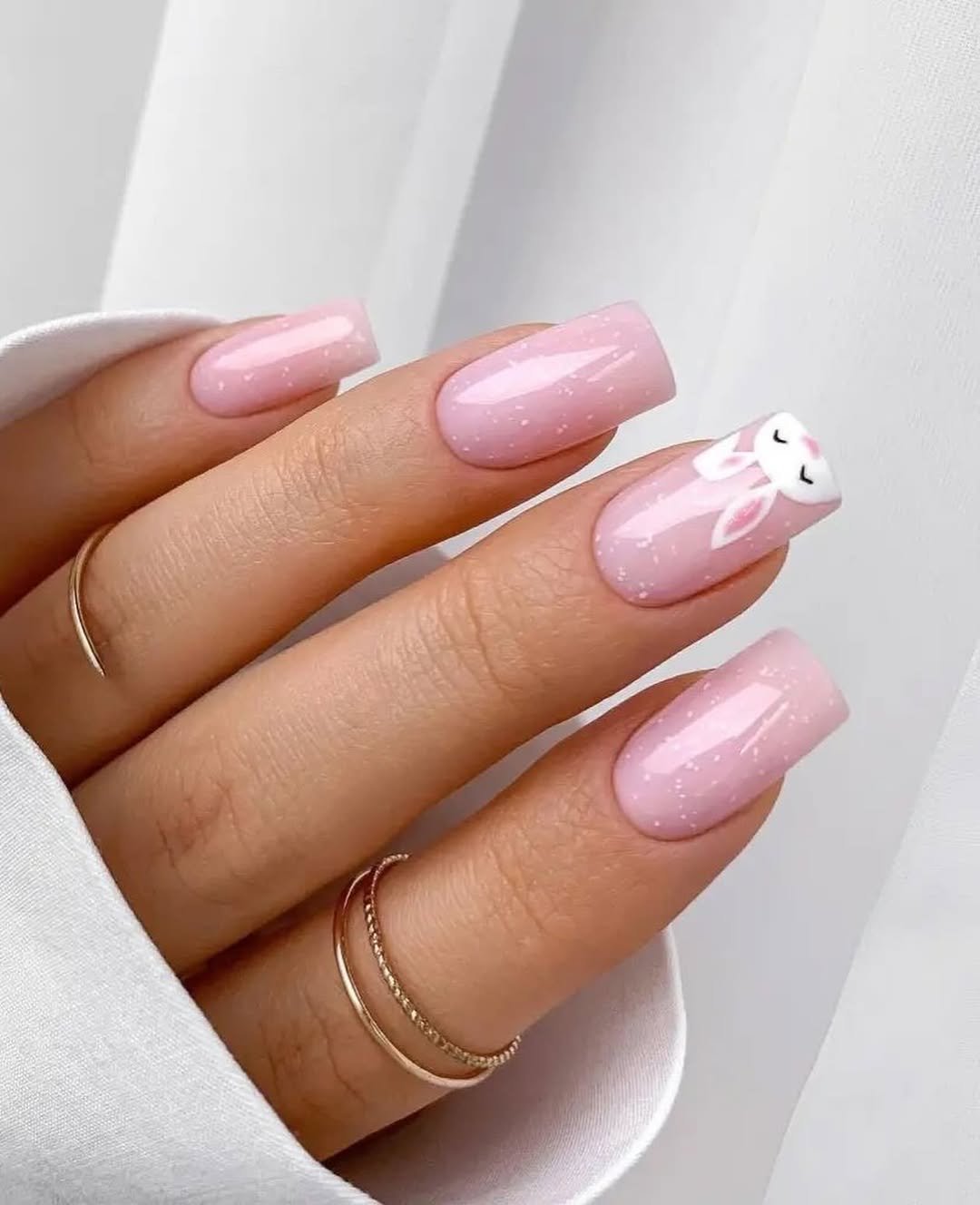 Sometimes simplicity wins. A glossy blush pink base with a single bunny accent nail keeps things soft and sweet without too much detail.