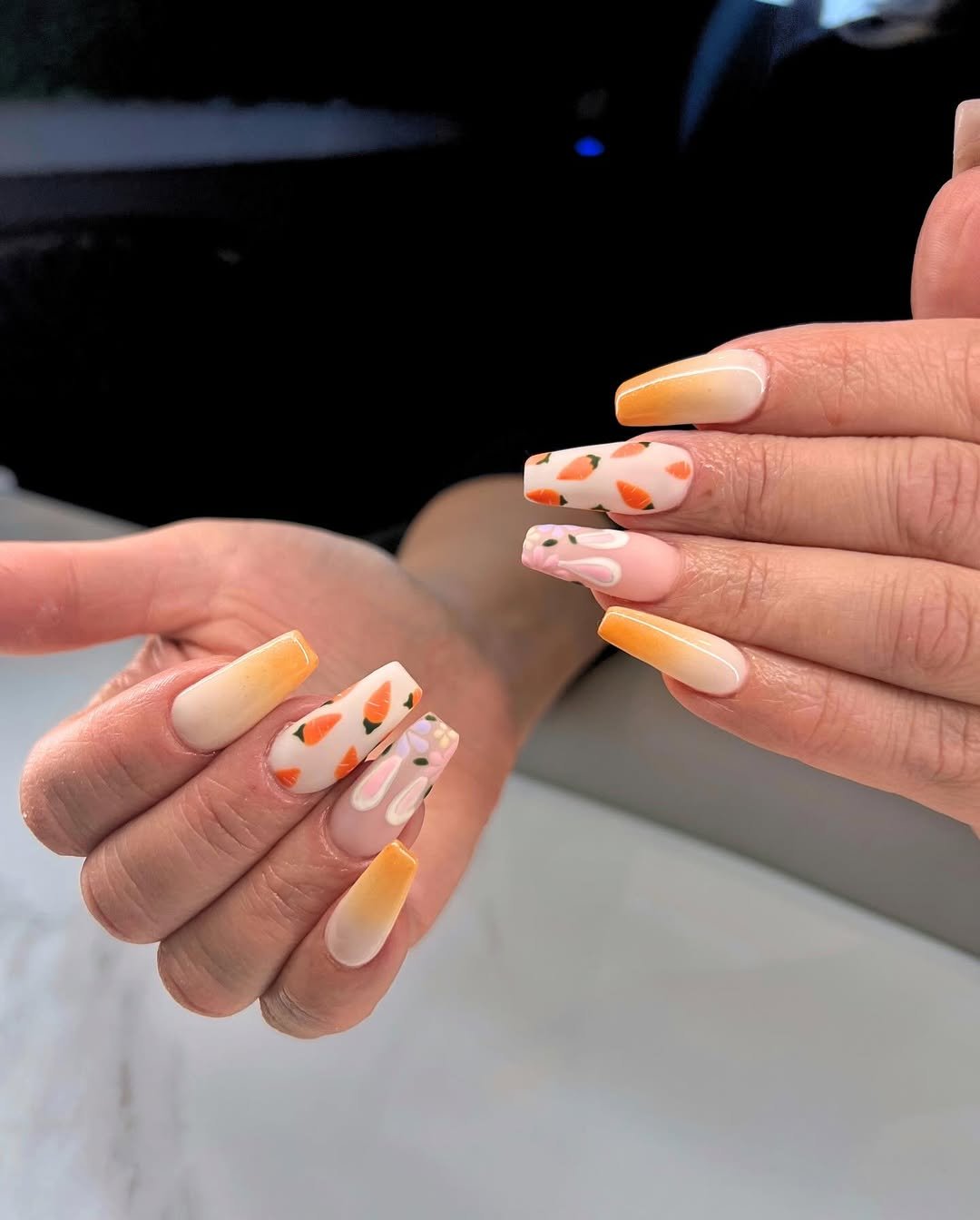 If Easter had a signature print, this would be it. A creamy nude base meets tiny carrot motifs and warm orange ombré tips, blending garden charm with a modern coffin silhouette.
