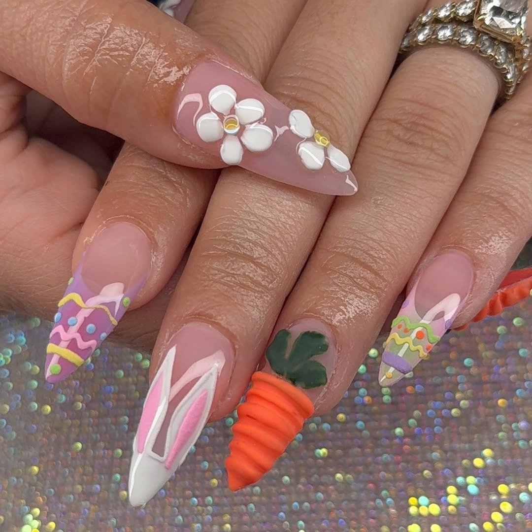 This set feels like you dumped out an Easter basket and turned every treat into nail art. Sculpted carrot detail, bunny ears, pastel egg patterns, and a glossy floral accent all share the spotlight.
