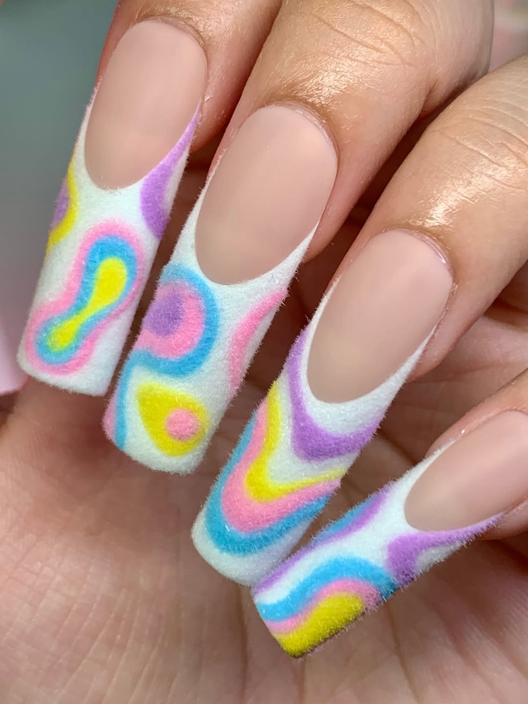 You don’t expect texture like this, and that’s exactly why it works. A matte nude base melts into plush, fuzzy pastel swirls in pink, yellow, blue, and lavender.