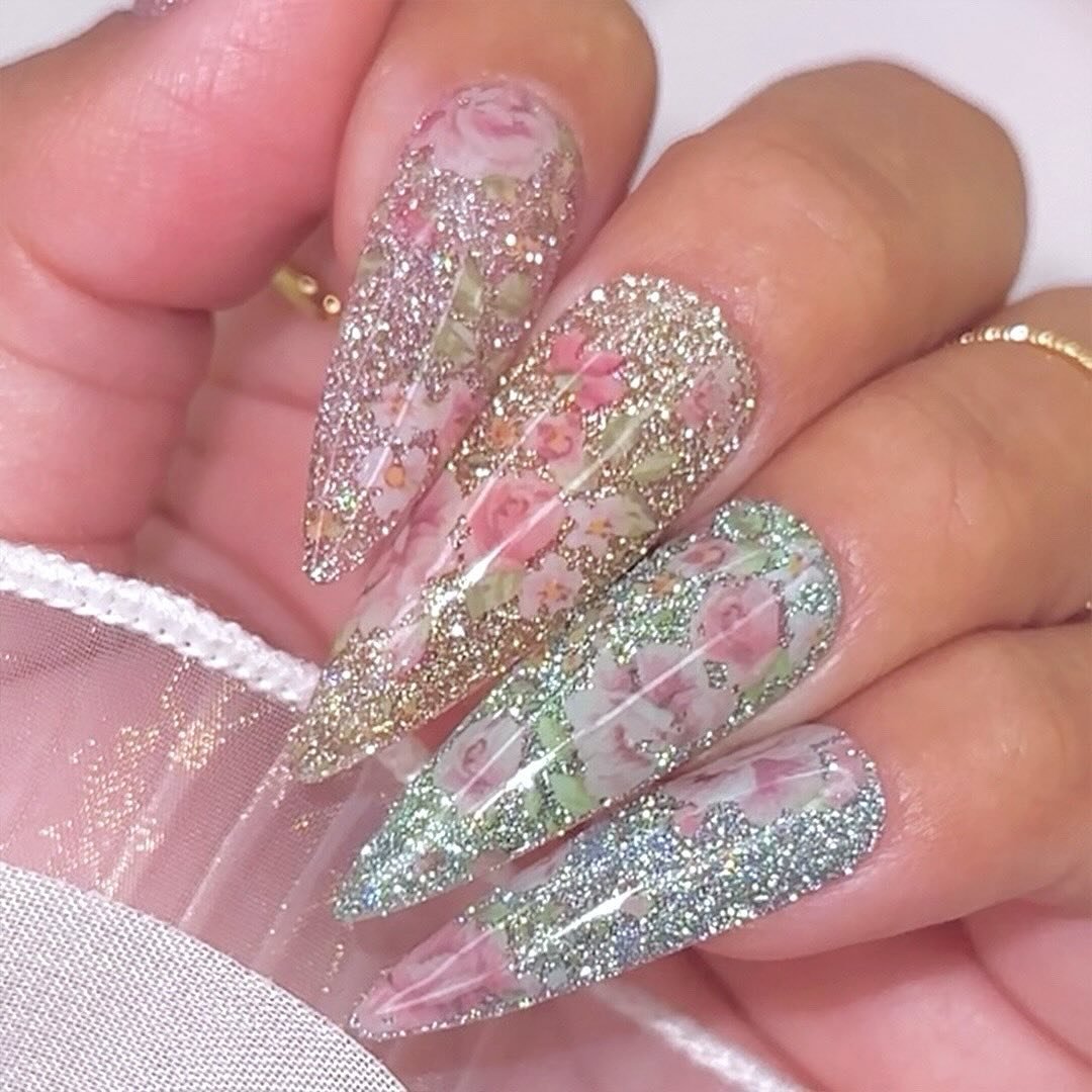 If you love sparkle, this floral glitter set is pure magic. Layers of fine shimmer frame delicate rose designs, creating a garden effect that feels romantic and celebratory.