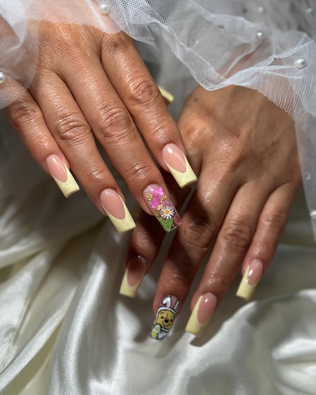 Soft yellow French tips on a nude base instantly feel fresh, like the first warm Sunday of spring. Add a floral accent with pressed blooms and flecks of gold, and suddenly it’s giving Easter brunch with mimosas.