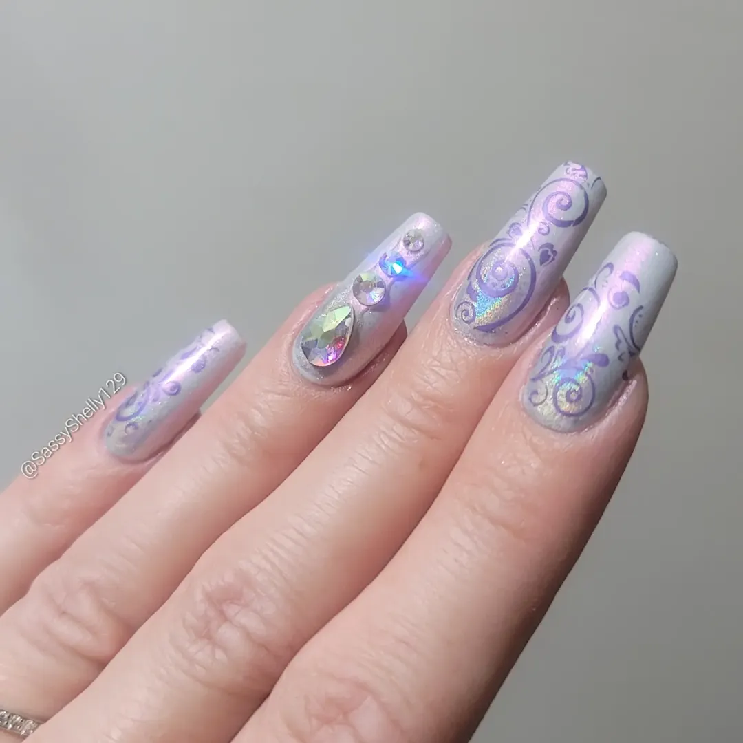 Holographic lavender shimmer paired with ornate swirl detailing makes this set feel almost regal.
