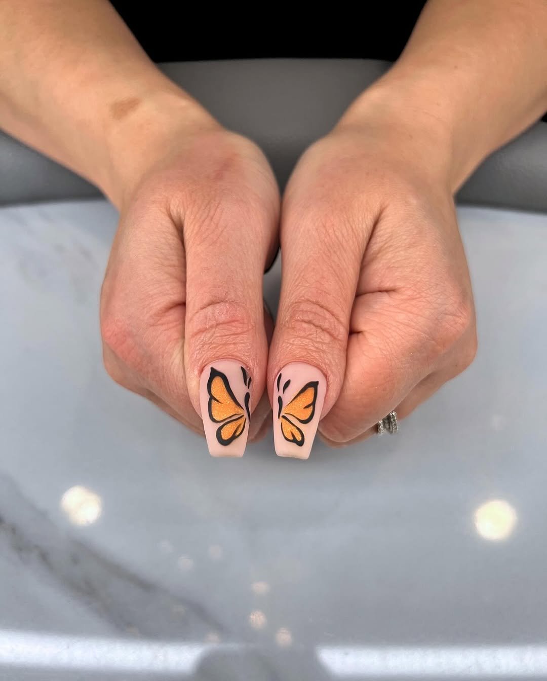 There’s something about a butterfly set that instantly feels like spring unfolding. This design pairs a soft nude base with bold orange and black butterfly wings across the accent nails, creating that monarch-inspired drama without overwhelming the look.