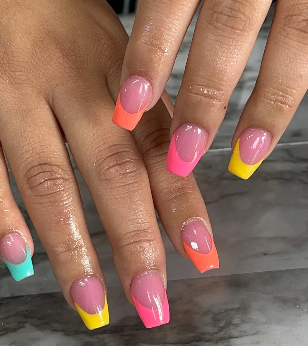 Classic square tips get a bold twist with neon pink, coral, yellow, and mint French edges over a glossy rose base.