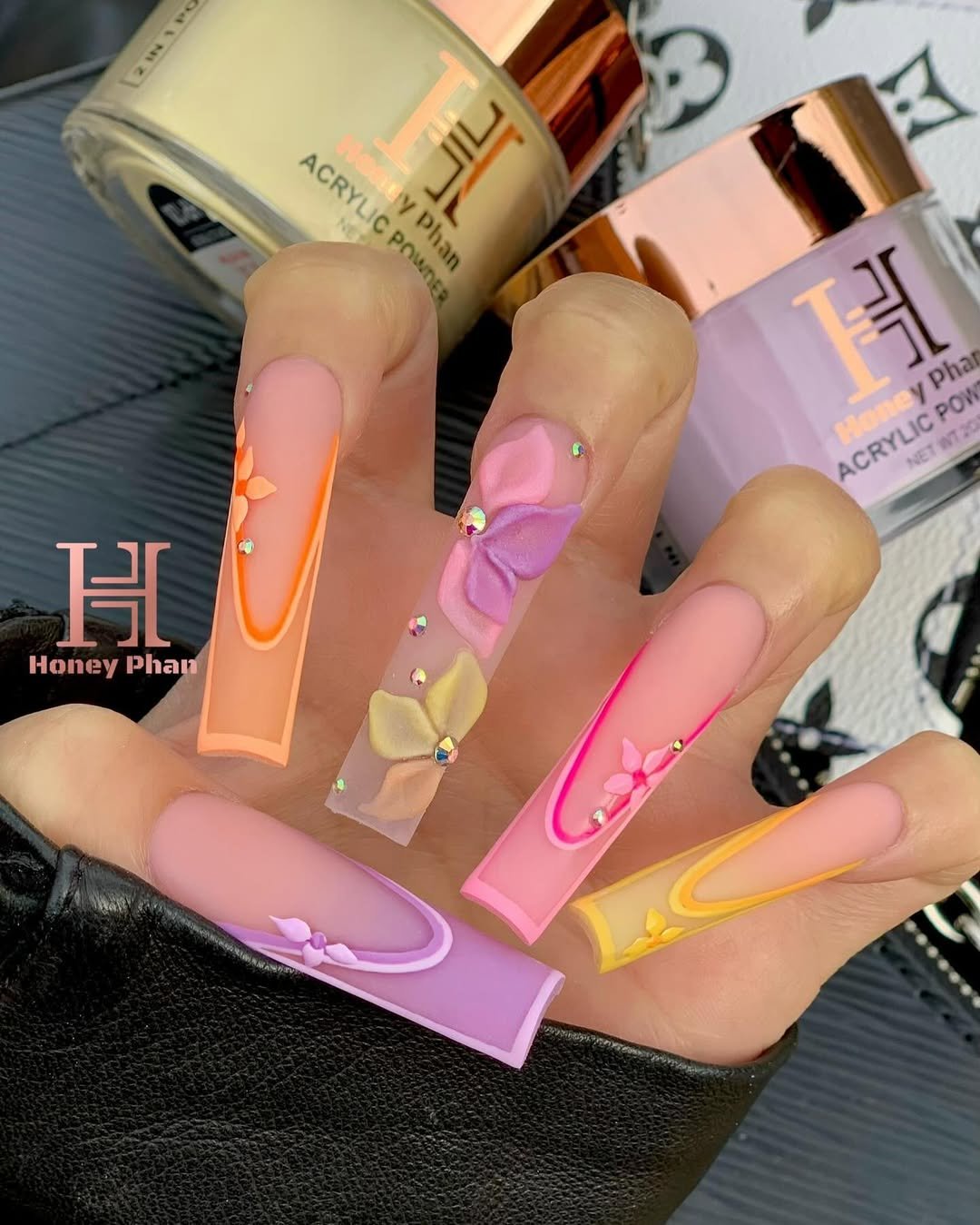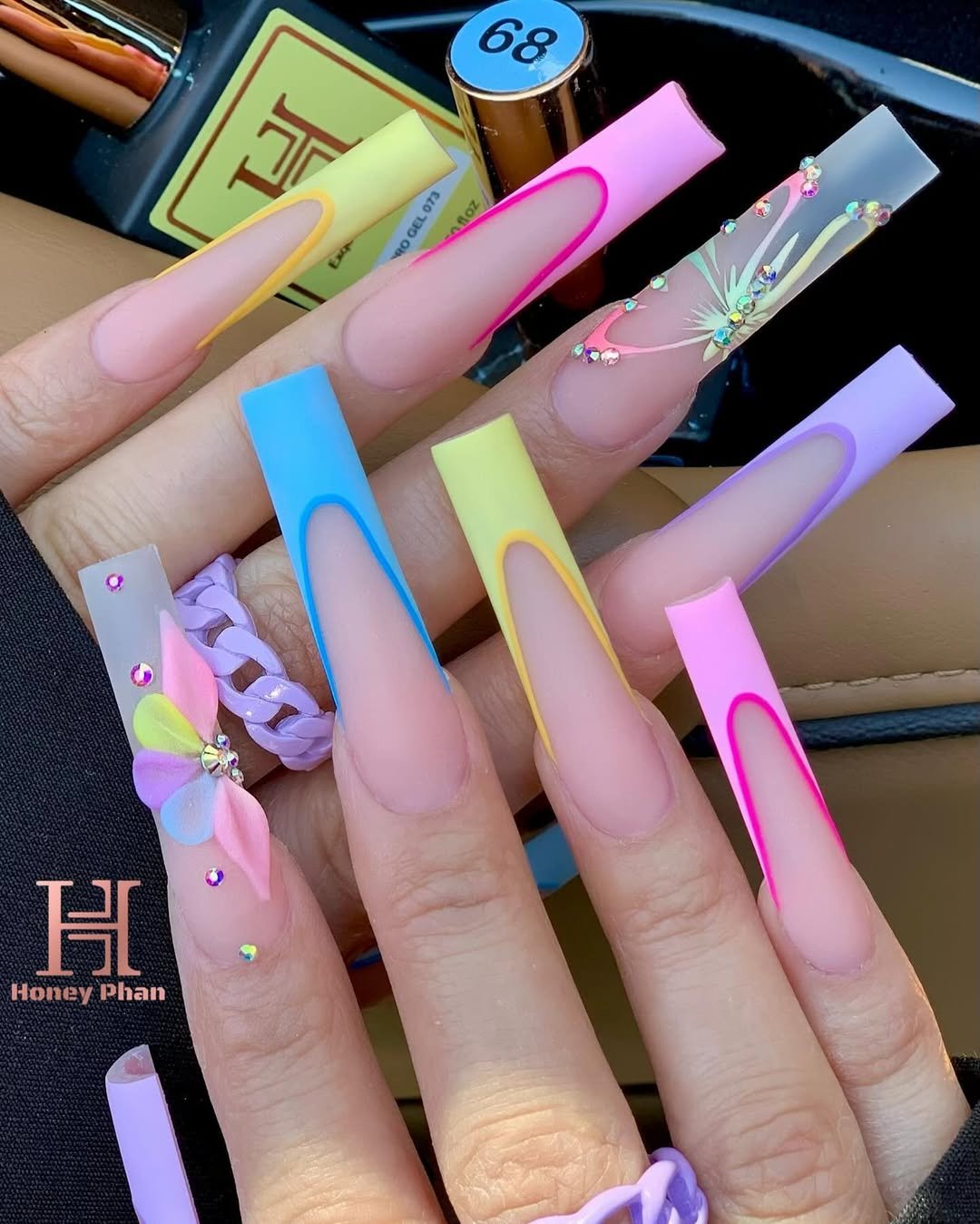 This set mixes neon-edged coffin tips with a fully sculpted 3D bow accent, complete with crystals. Pink, peach, lilac, and yellow melt into one another like Easter candy.
