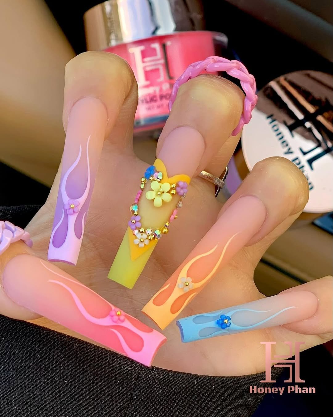 Flame tips, but make them Easter. Soft pastel flames in pink, lavender, yellow, and blue flicker over a nude base, with a crystal-studded accent nail adding just enough glam.