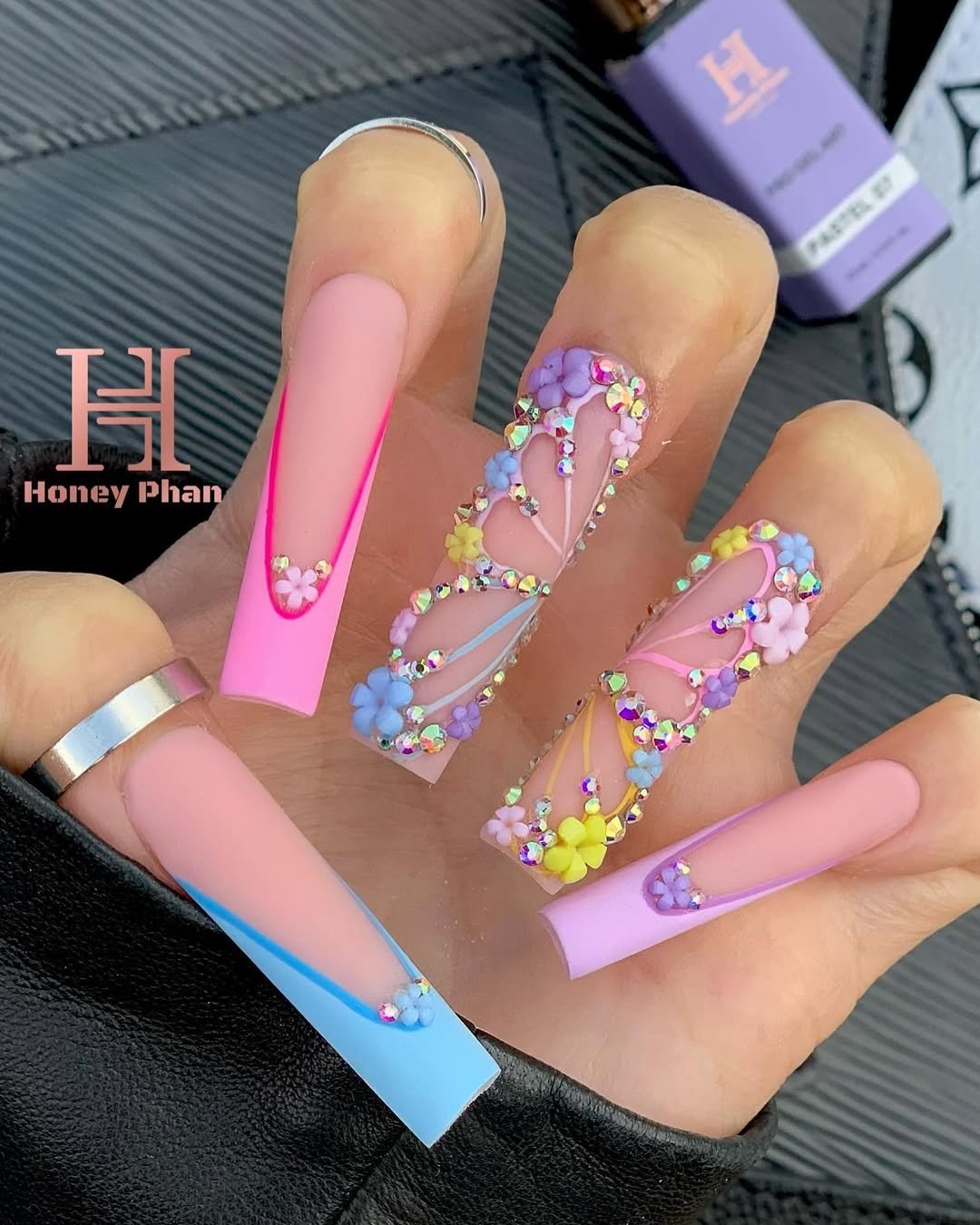 Now this is drama. Long coffin nails in matte pink and blue gradients are framed with rhinestones and tiny pastel flowers, creating a full butterfly-wing illusion across the hand.