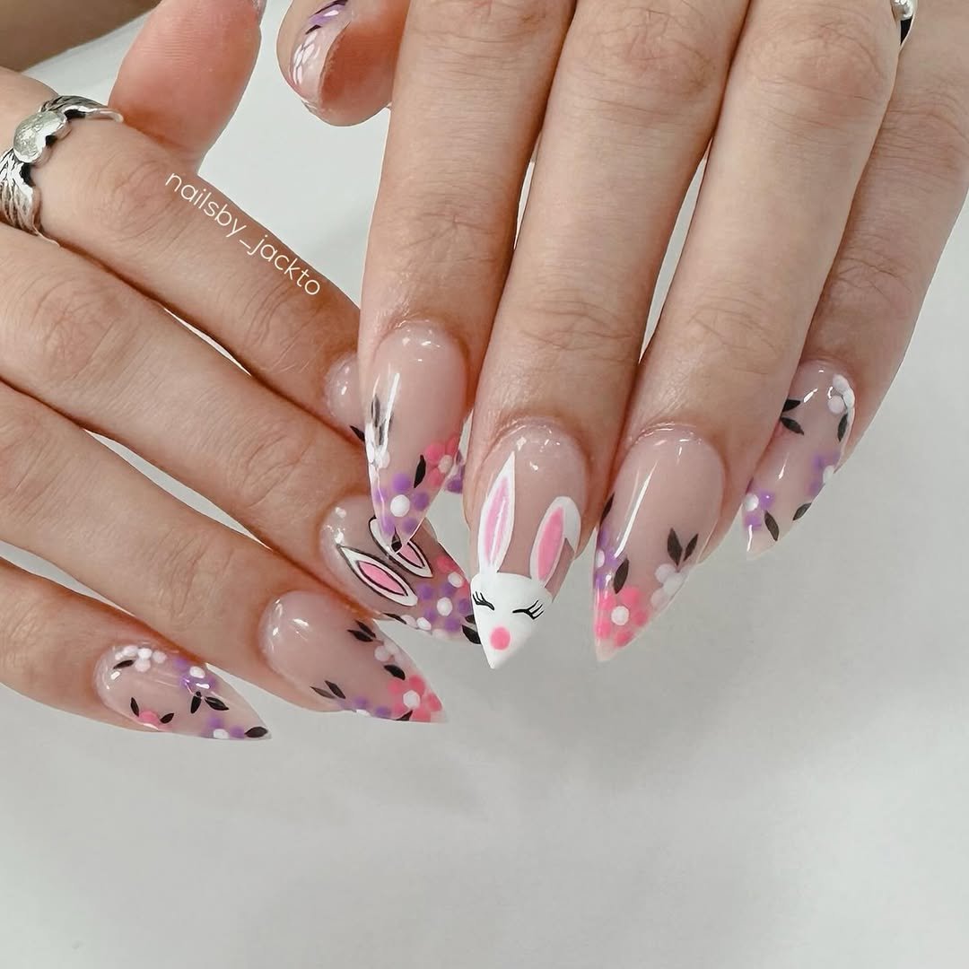 This set feels like Easter confetti scattered across your nails. A soft nude base keeps things calm while pops of pink, lilac, and white float around playful bunny silhouettes.