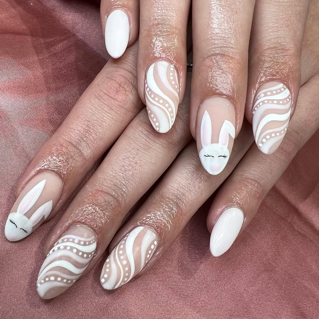 There’s something about these matte white and nude nails that feels quietly magical. Flowing lines swirl across the nails like delicate ribbons, while a soft sculpted bunny adds the sweetest Easter detail.