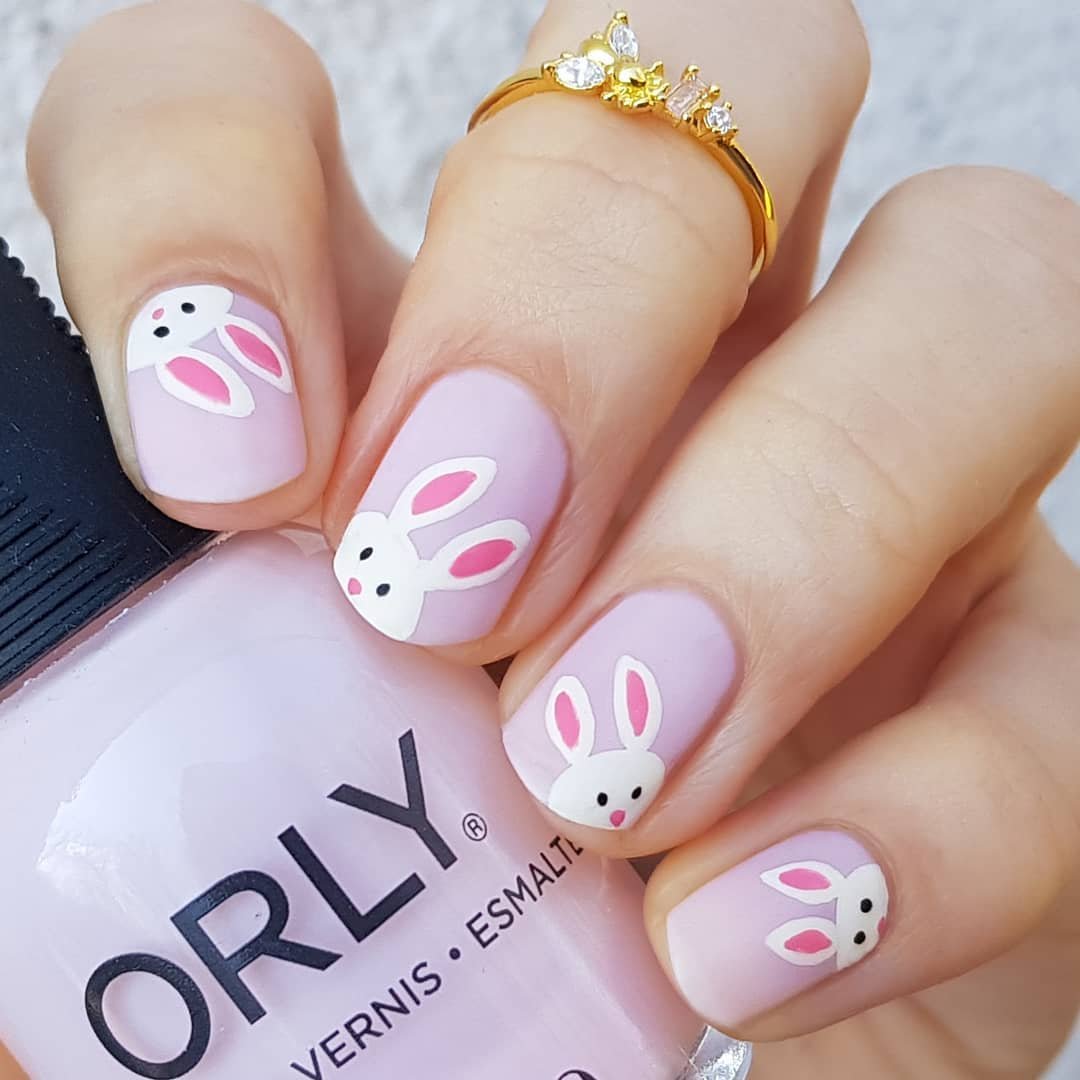 Sometimes the cutest ideas are the simplest. Soft lavender nails become the perfect backdrop for tiny white bunny faces peeking from each fingertip.