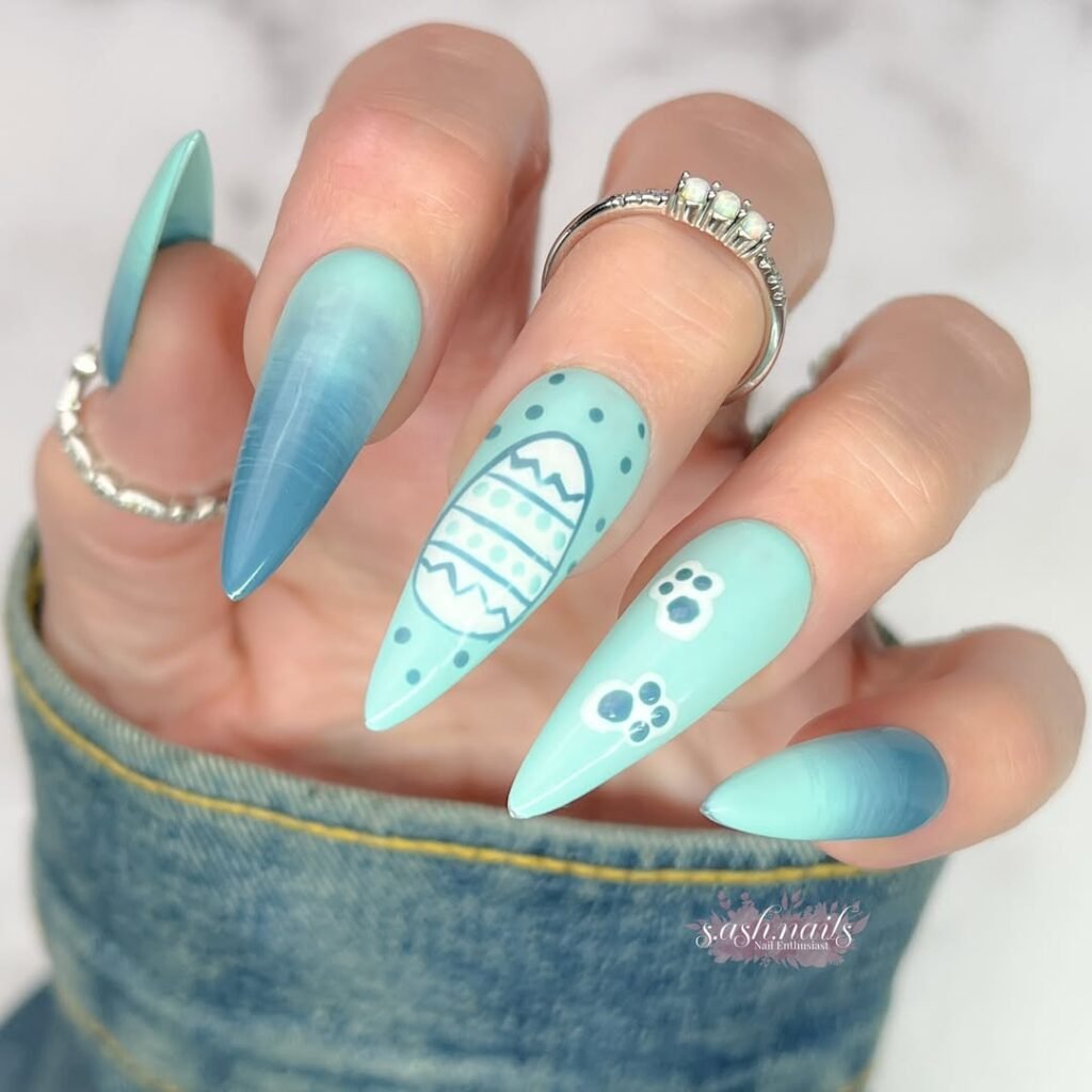 This set feels like Easter eggs dipped into ocean water. Soft turquoise fades into deeper blue tones across long stiletto nails, creating a cool gradient that feels both fresh and artistic.