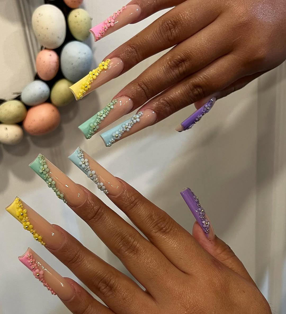 These nails feel like Easter candy, but elevated. Soft pastel tips in lemon yellow, baby pink, mint, and lavender glide across long square nails, each lined with delicate crystal beads that catch the light like tiny sugar sprinkles.