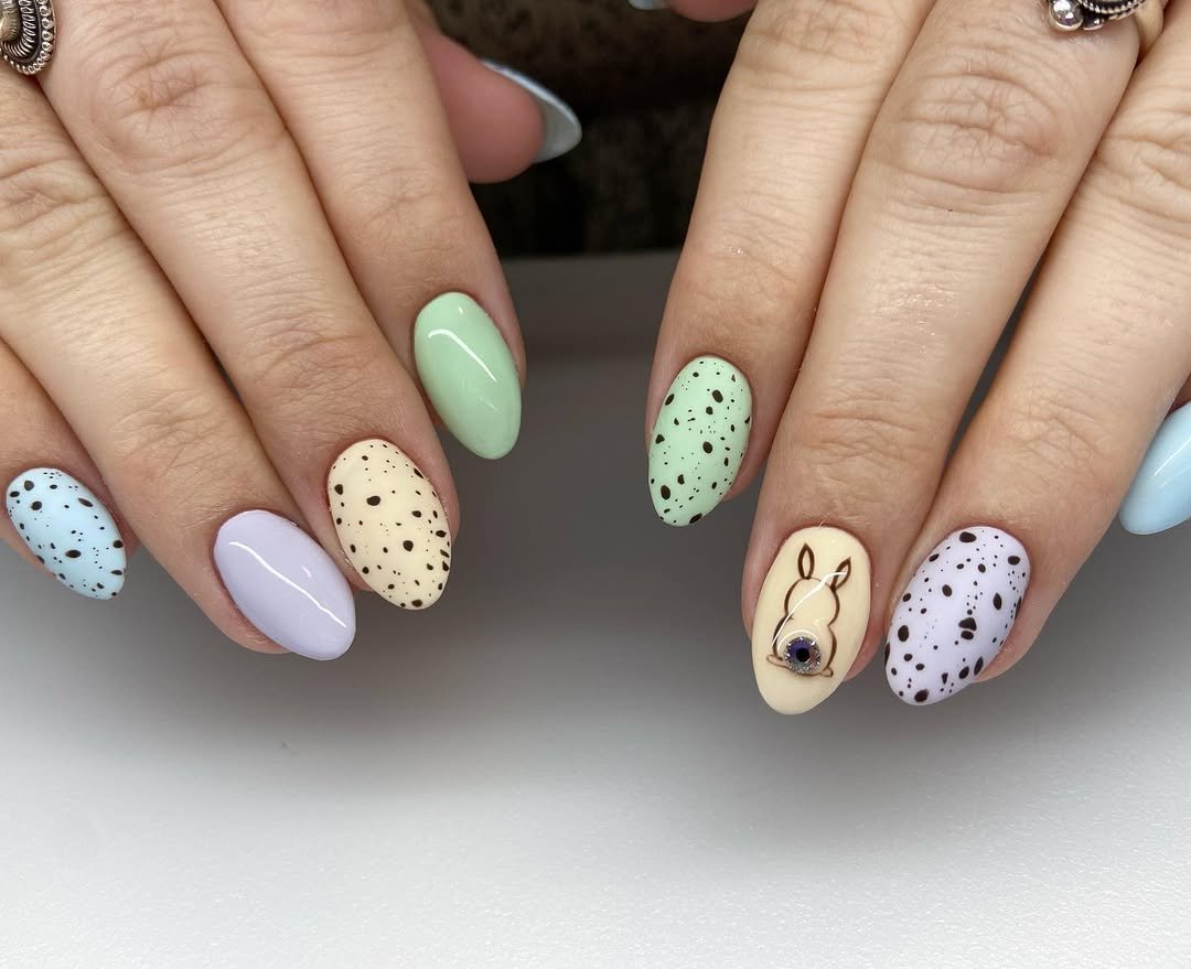 This final look leans into soft Easter pastels with a twist. Almond-shaped nails painted in mint, lilac, and blush are finished with delicate black speckles that mimic classic speckled eggs.