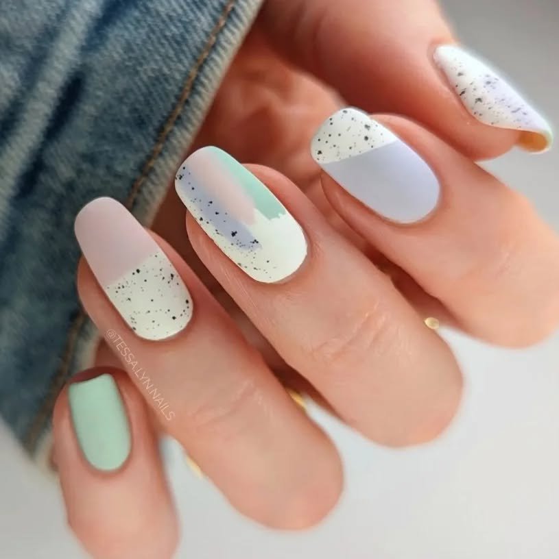 Speckled nails always remind me of classic chocolate Easter eggs, and this pastel version takes that idea in the prettiest direction. Lavender, mint, cream, and soft blue create a dreamy spring palette that feels fresh and light.