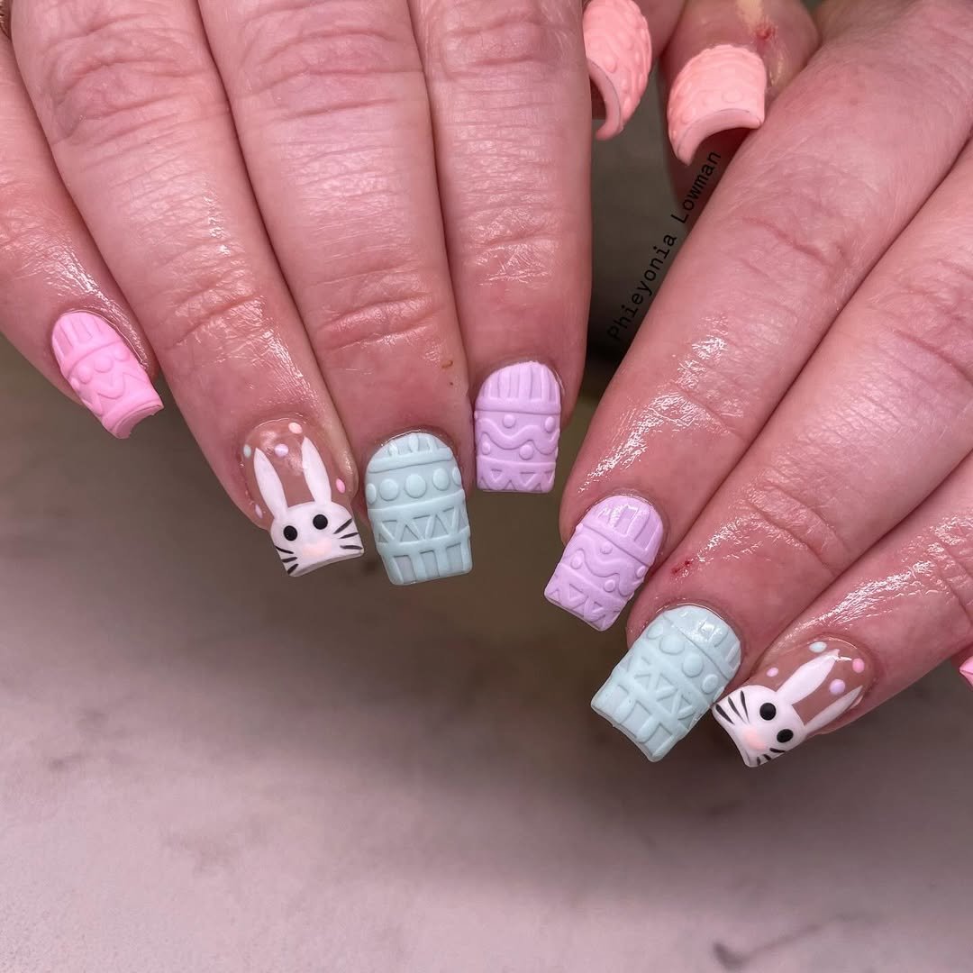 These nails are pure Easter creativity. Soft pastel shades of pink, lavender, and baby blue are sculpted with raised textures that look like decorated Easter eggs.