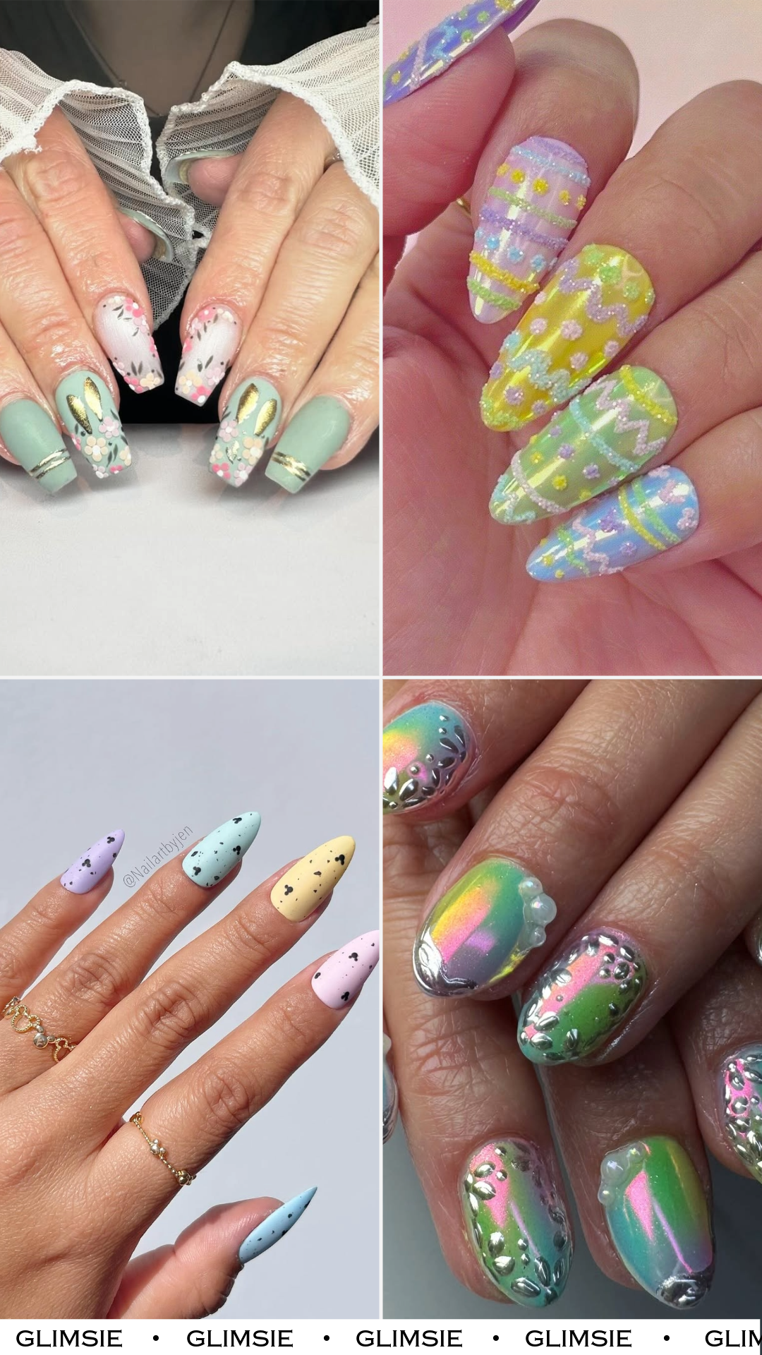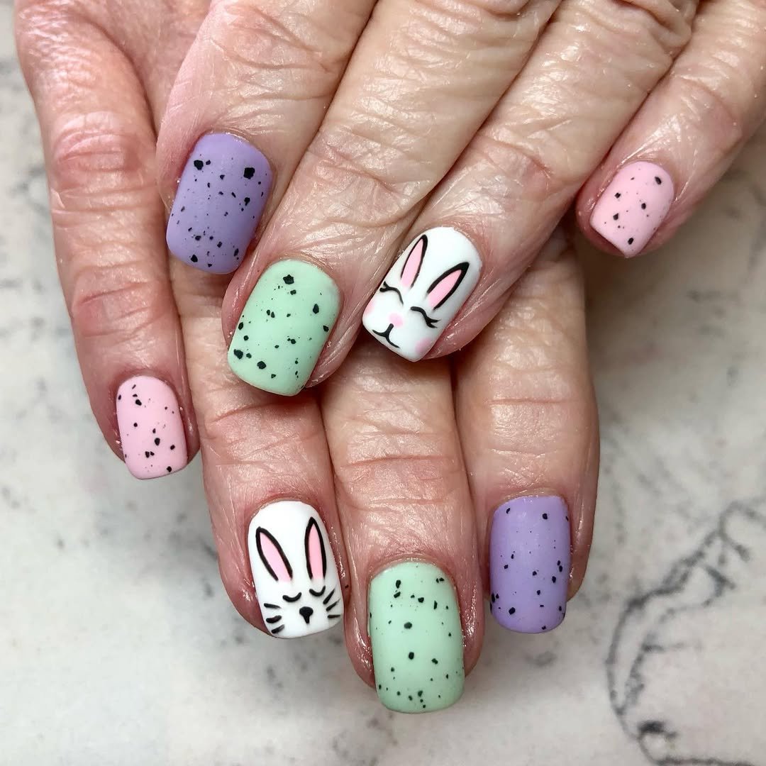 These nails go full Easter nostalgia — glittery bunny shapes, dotted backgrounds, and candy-store color combos. It’s giving “peeps but make it glam,” and honestly, we’re here for it.