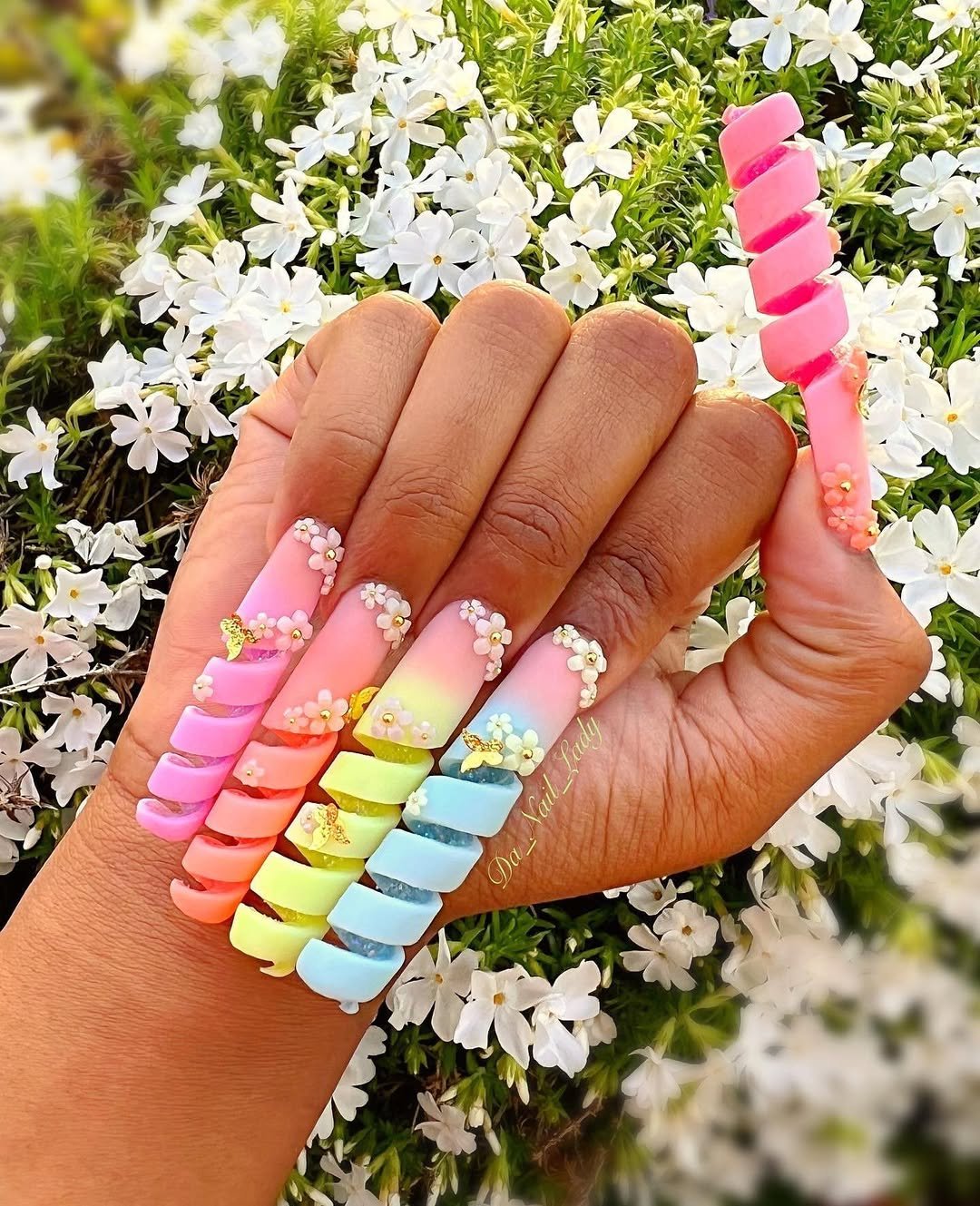 This set goes full maximalist in the most joyful way — neon pastels, cascading florals, and the iconic spiral extensions that look straight out of a candy wonderland. It’s playful, bold, and absolutely impossible to ignore.