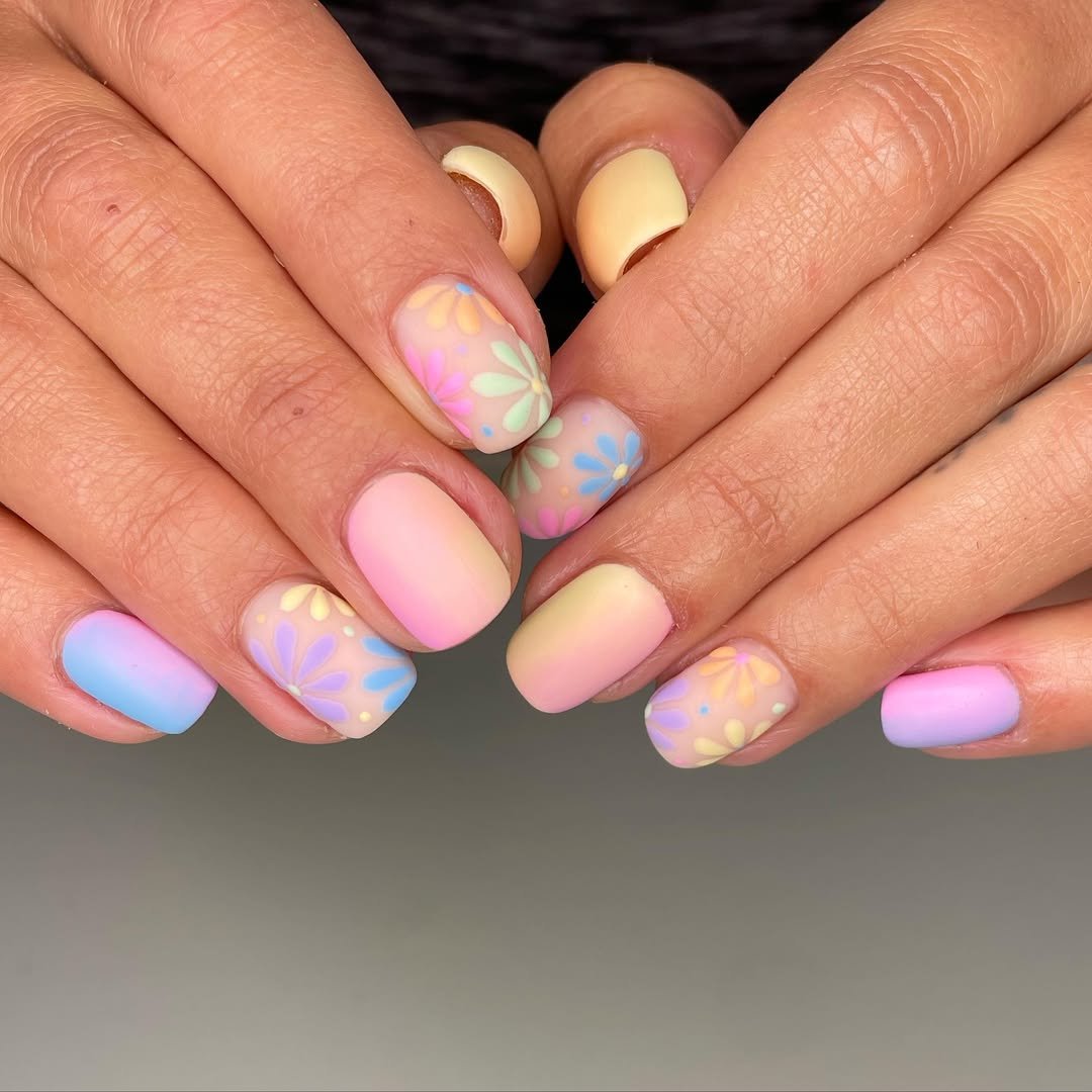 Each nail flows into the next with buttery blends of mint, peach, lilac, and butter-yellow. It’s Easter… but elevated into pure aesthetic territory.