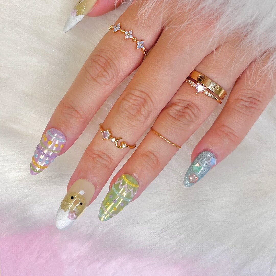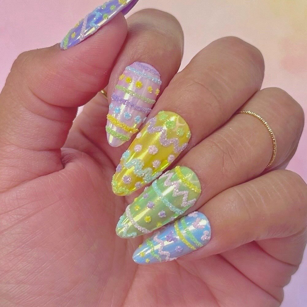 These nails look like hand-decorated Easter eggs — colorful, detailed, and dusted with the prettiest textured accents. Every swirl and dot adds to the sweet, candy-like vibe that makes them feel so spirited and fun.