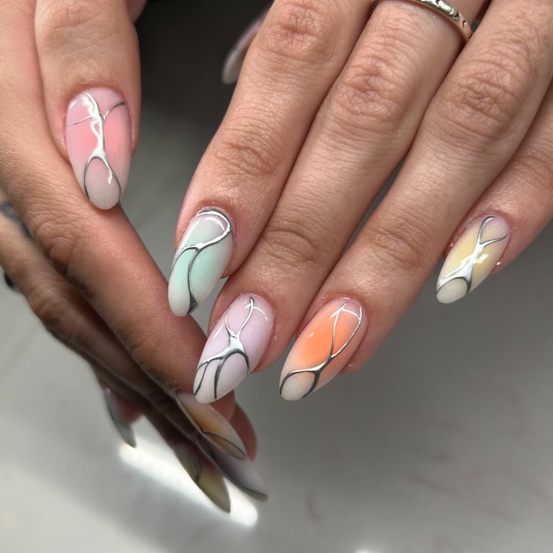 This rainbow chrome set looks like an iridescent Easter egg dipped in metallic magic. Soft gradients melt into reflective silver details and pearl accents that make each nail look luxuriously dimensional.