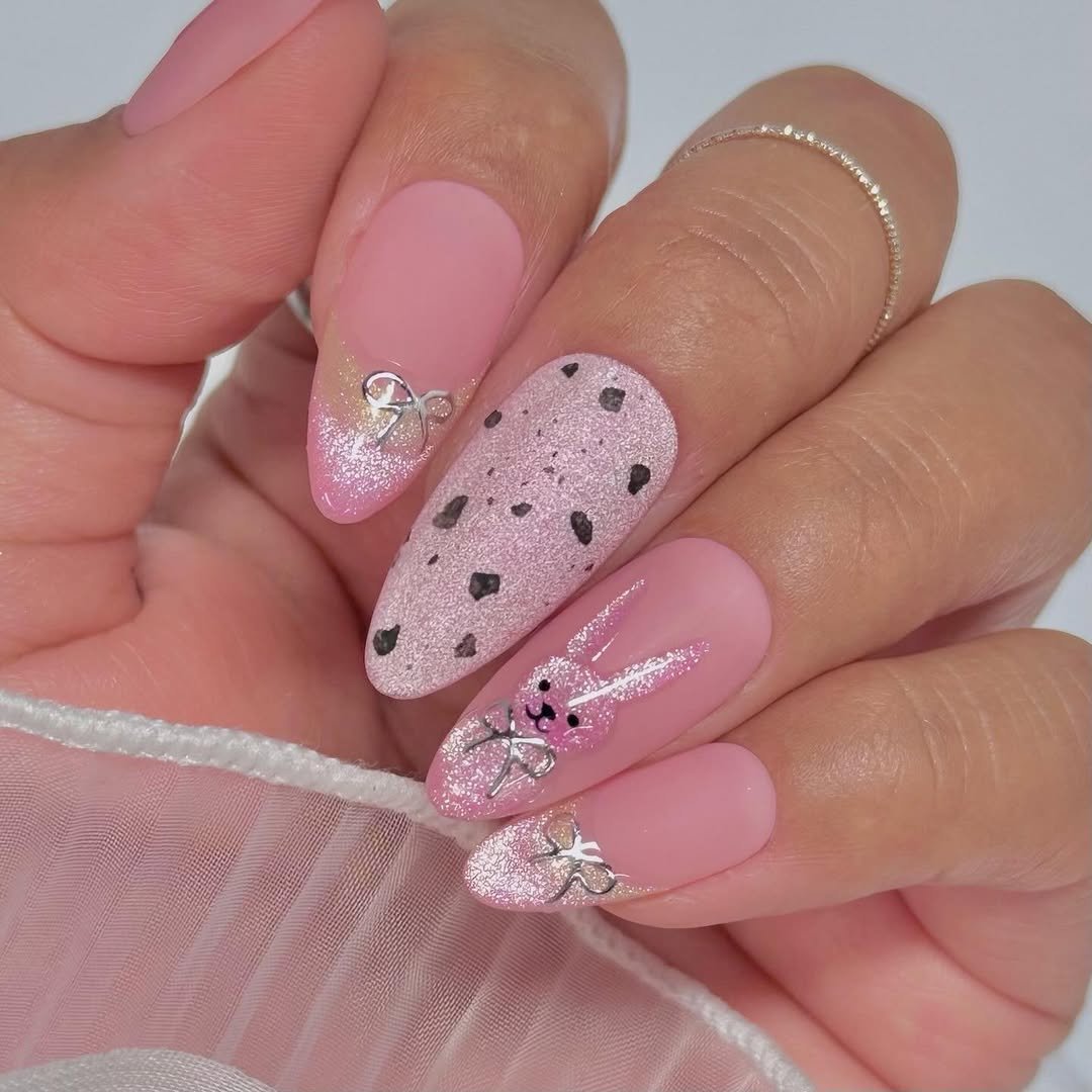 Soft pink matte meets glittery bunny accents, tiny bows, and the cutest speckled nail that mimics candy shells. It’s feminine and sweet, with just enough texture to keep things interesting.