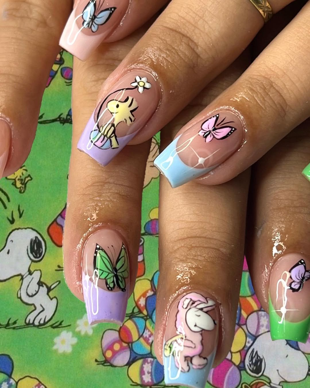 You get all the Easter nostalgia in one place — pastel tips, floating butterflies, and the cutest Snoopy characters bringing the charm. The artwork is crisp and lively, like a storyboard unfolding across your nails.