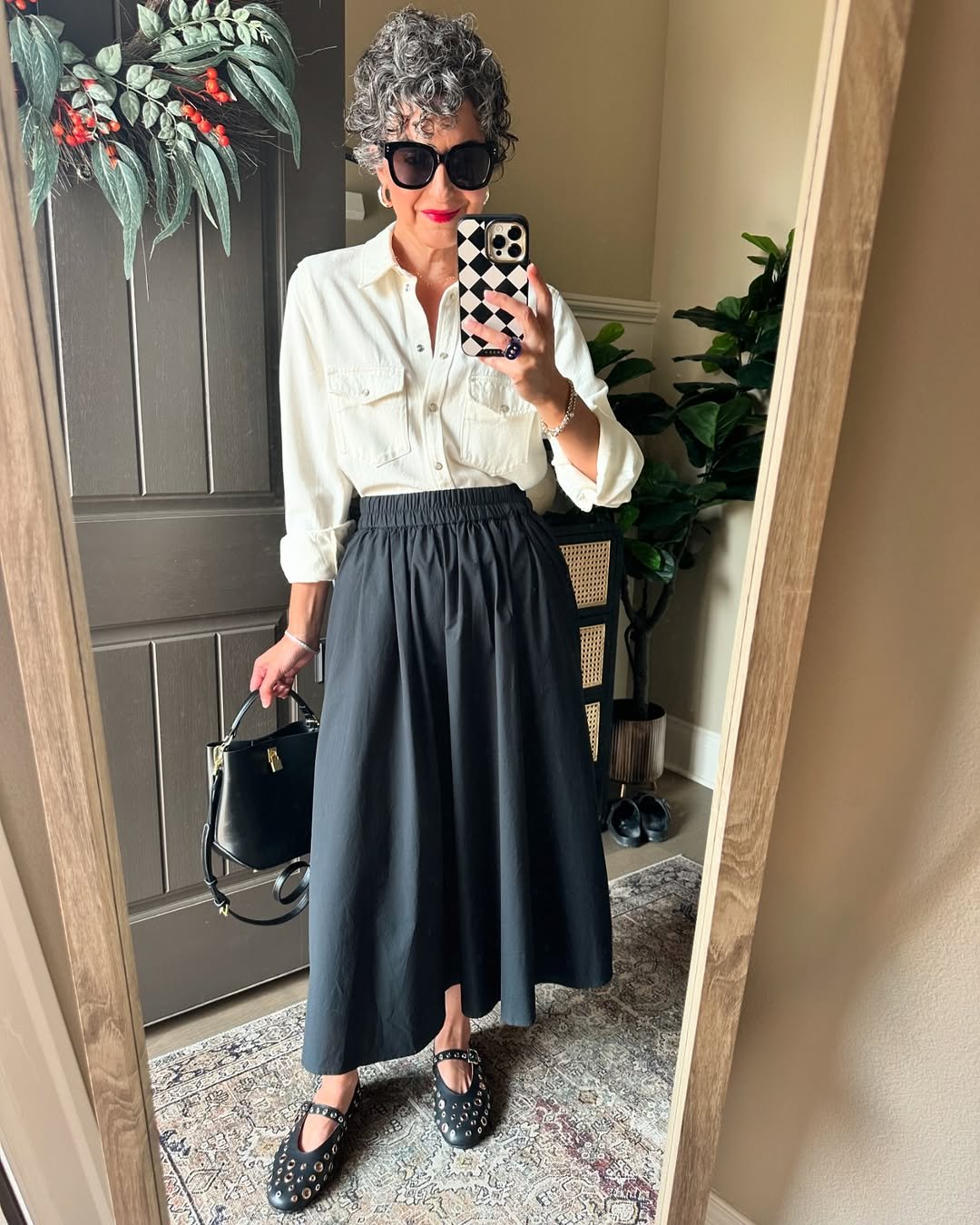 This outfit is proof that black and white never goes out of style. A crisp white button-down tucked into a voluminous black midi skirt creates that beautiful balance between tailored and dramatic.