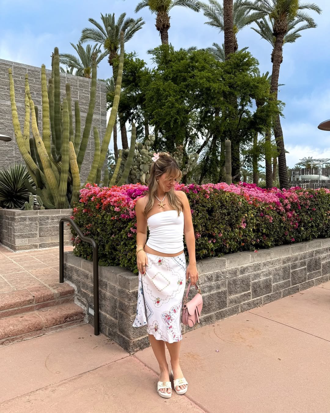 This outfit feels like sunshine and warm air in clothing form. A fitted white tube top paired with a soft floral midi skirt creates that easy spring silhouette that always feels right this time of year.